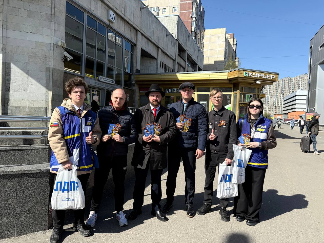 В День Победы активисты Санкт-Петербургского отделения ЛДПР провели праздничную акцию, раздавая горожанам памятные открытки с изображениями героев Великой Отечественной войны и словами благодарности за мирное небо над головой